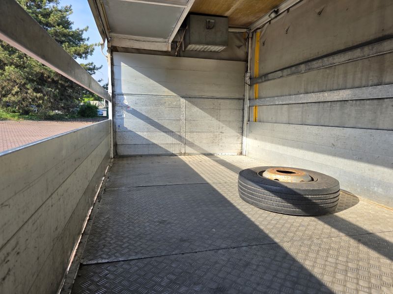 Cassone centinato di dimensioni esterne 4,40x2,31x2,14 m. Luce 2,05 m. Cabina corta, cambio manuale, balestrato. No aria condizionata. Tenda per mercati meccanica.